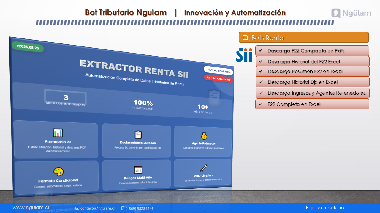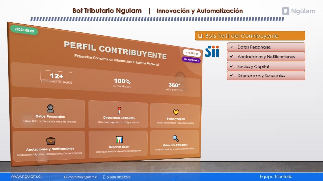 Centraliza toda la información oficial del contribuyente desde el SII y genera reportes en Excel con datos legales, contactos, actividades, documentos autorizados, bienes, sociedades y notificaciones, listo para análisis o auditoría.