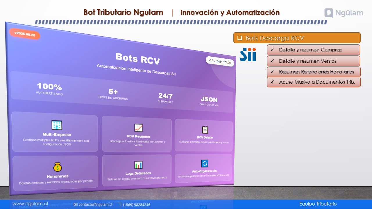 Automatiza la descarga del RCV con resumen, detalle, boletas y acuses desde el SII.