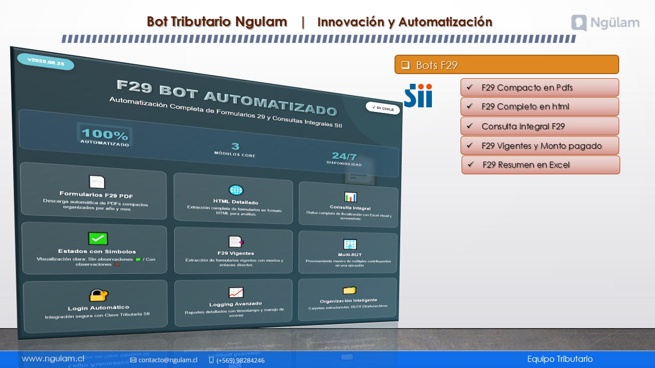Automatiza la descarga del F29 en formatos PDF y HTML, genera reportes en Excel con formularios vigentes y observaciones, y permite una consulta integral para control y análisis tributario eficiente.