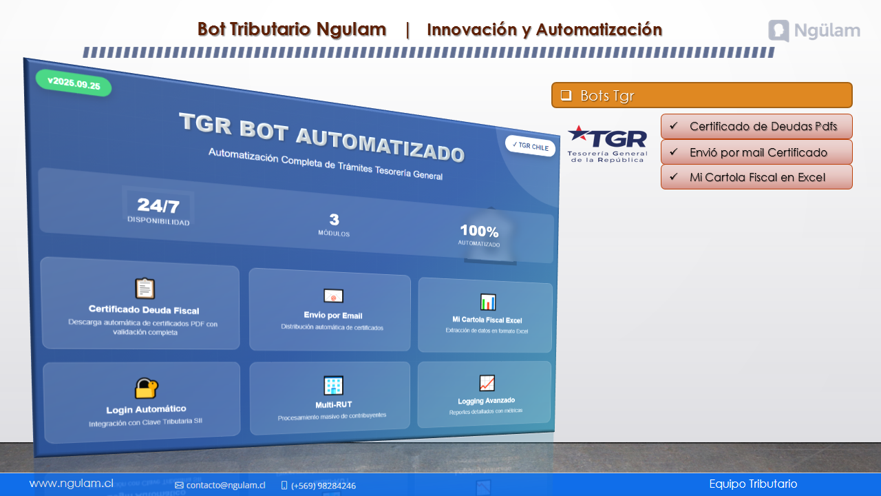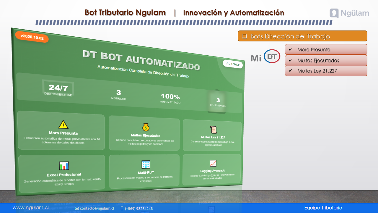 Nuestros bots especializados automatizan procesos dentro del Servicio de Impuestos Internos (SII), Previred, Tesorería General de la República (TGR) y Dirección del Trabajo (DT).Cada bot ejecuta tareas críticas como descarga masiva de documentos, carga de datos, consultas históricas, generación de reportes y validaciones en tiempo real.t