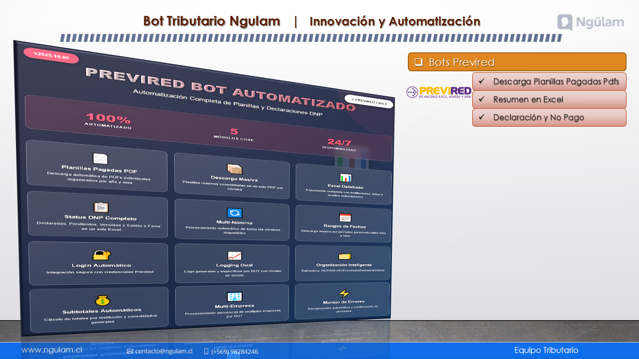 Gestiona tus obligaciones del SII, Previred, Tesorería y Dirección del Trabajo de forma automática con nuestros bots conectados al ecosistema tributario chileno.