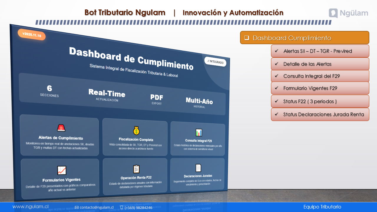 Centraliza toda la información del SII, TGR y DT, con alertas de cumplimiento, comparativos tributarios y laborales, y estados del F29 y F22. Permite seleccionar empresa y año, generar reportes en PDF y analizar saldos y operación renta por régimen, todo desde un panel visual y fácil de usar, instalado en servidor local con configuración validada automáticamente.
